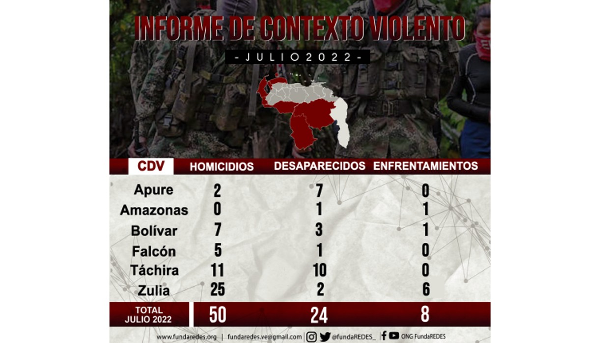 El Informe de Contexto Violento correspondiente al mes de julio de 2022 elaborado por FundaRedes documentó 97 homicidios en estos 12 estados de estudio, donde activistas han denunciado violación a los Derechos Humanos.