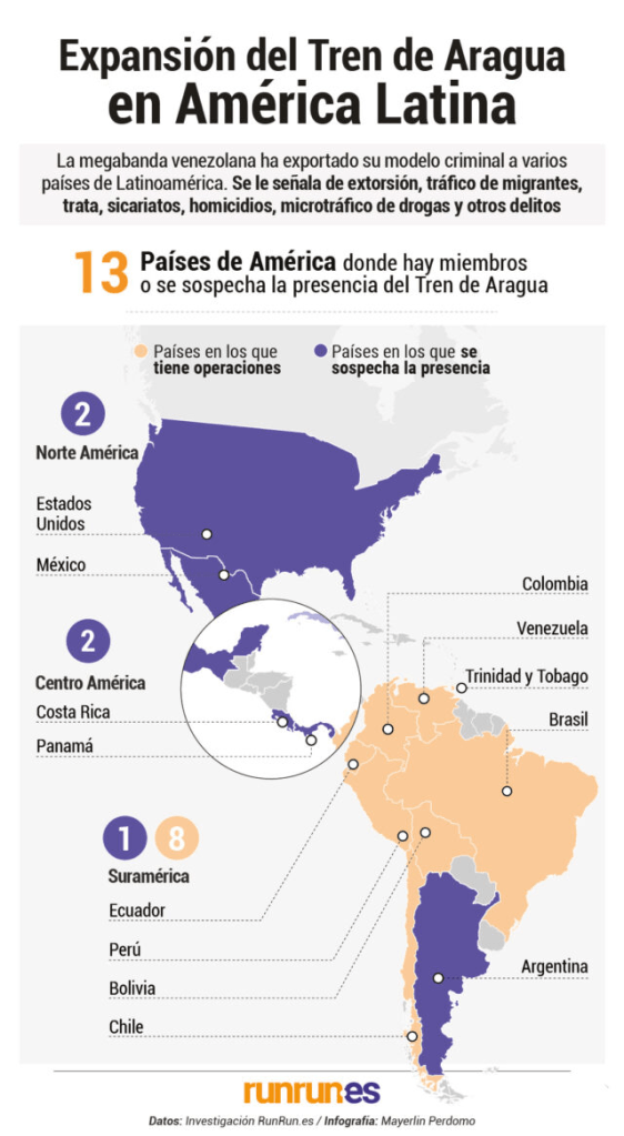 El Tren de Aragua ha estado involucrado en territorio venezolano en homicidios, extorsiones, secuestros, narcotráfico y contrabando; crímenes con los que también deja su huella criminal en Colombia, Ecuador, Perú, Chile, Brasil y Bolivia, donde “han incorporado nuevos delitos, como el tráfico de migrantes y la trata de mujeres para la explotación sexual”, escribió la periodista Yeannaly Fermín en RunRun.es.