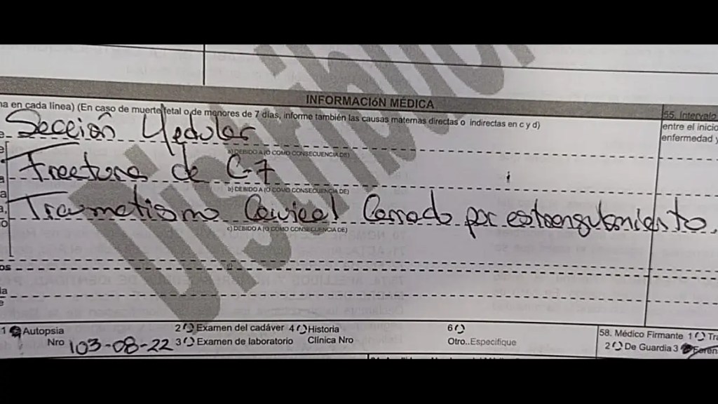 El informe de la necropsia determinó que la muerte fue producto de asfixia mecánica. Sin embargo, vale destacar que ese mismo informe señala otra lesión mortal, una fractura de la vértebra cervical C7 con sección medular, o sea que la médula espinal fue cortada producto de un traumatismo, lesión que al menos le habría ocasionado cuadriplejía, si no hubiese muerto.