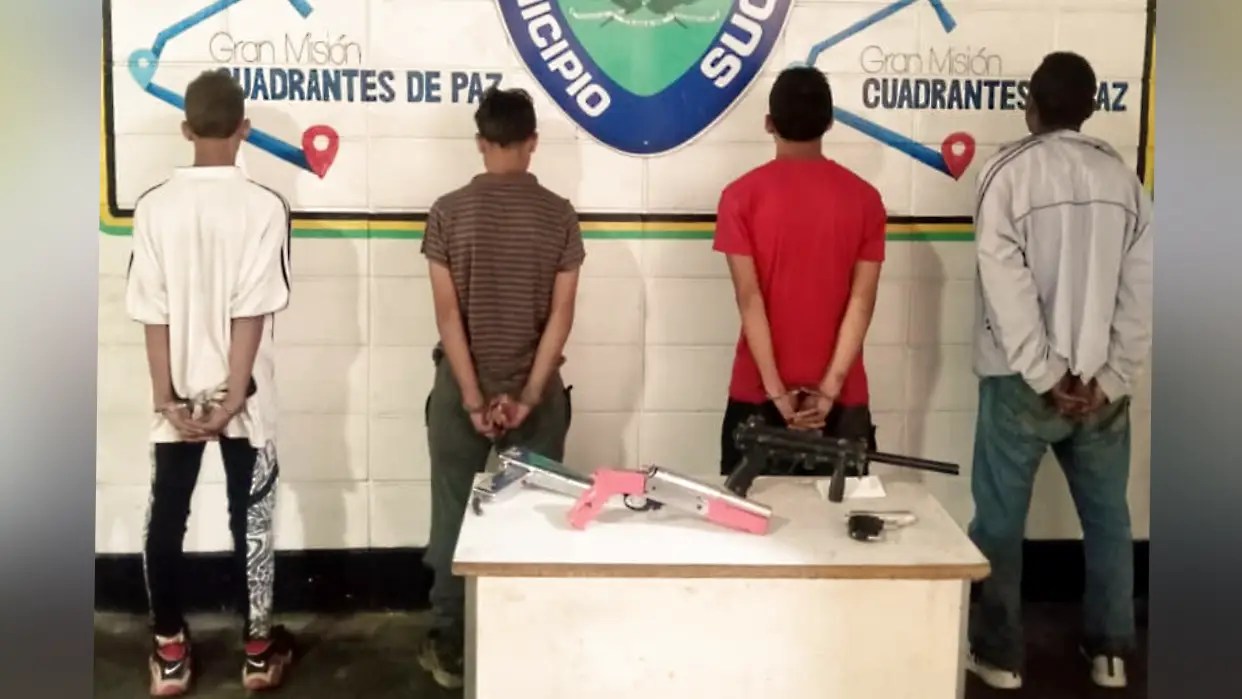 Los funcionarios lograron ubicar a cuatro sujetos, quienes se encontraban ocultos en la maleza, quienes fueron detenidos, tres adolescentes y un adulto. A los detenidos les incautaron una escopeta, serial 20415, cromada, de empuñadura color rosa, además se incautaron tres facsímiles, una de un AR15, y dos de pistolas.