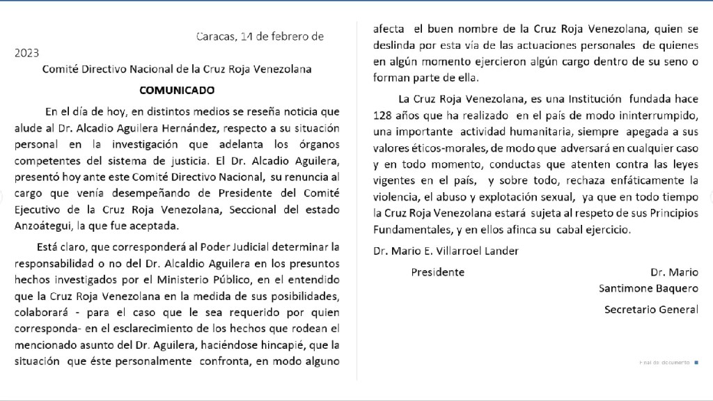 En el comunicado firmado por Mario Santimone, secretario general de la Cruz Roja Venezolana, la institución expresa que Alcadio Aguilera Hernández «confronta situación personal en el ámbito penal» y «de manera voluntaria presentó su renuncia al cargo que venía desempeñado como presidente del Comité Ejecutivo de la Cruz Roja Seccional del estado Anzoátegui».