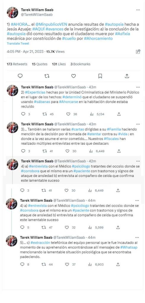 Según los tuits publicados a las 4:05 de la tarde de este viernes 21 de abril, el fiscal textualmente anunció «las resultas de la autopsia hecha a Jesús Azuaje en la que resalta que el ciudadano habría muerto como consecuencia de haber sufrido asfixia mecánica provocada por ‘constricción de cuello por ahorcamiento’”.