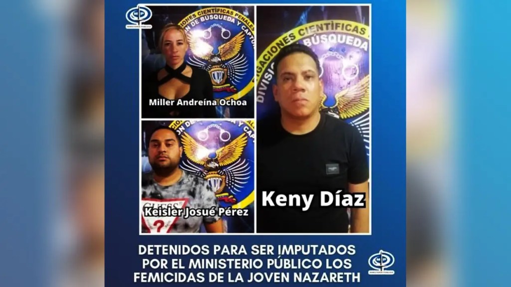El 30 de marzo, el fiscal Tarek William Saab anunció a través de sus redes sociales la detención de Keysler Josué Pérez, Keny Díaz y Miller Andreína Ochoa, a quienes imputó por el femicidio. Posteriormente, anunció la detención del comisario Alexander Ventura, jefe de Homicidios del Cicpc La Guaira, por el delito de encubrimiento.