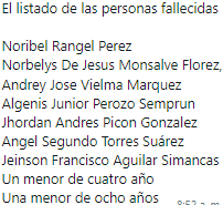 Los fallecidos fueron identificados como Noribel Rangel Pérez, Norbelys de Jesús Monsalve Florez, Andrey Jose Vielma Marquez, Algenis Junior Perozo Semprun, Jhordan Andrés Picón González, Ángel Segundo Torres Suárez y Jeinson Francisco Aguilar Simancas, así como dos menores de edad, un niño de cuatro años y una niña de ocho años. Las autoridades esperan que sus familiares identifiquen retiren los cadáveres de Medicina Legal de Bucaramanga.