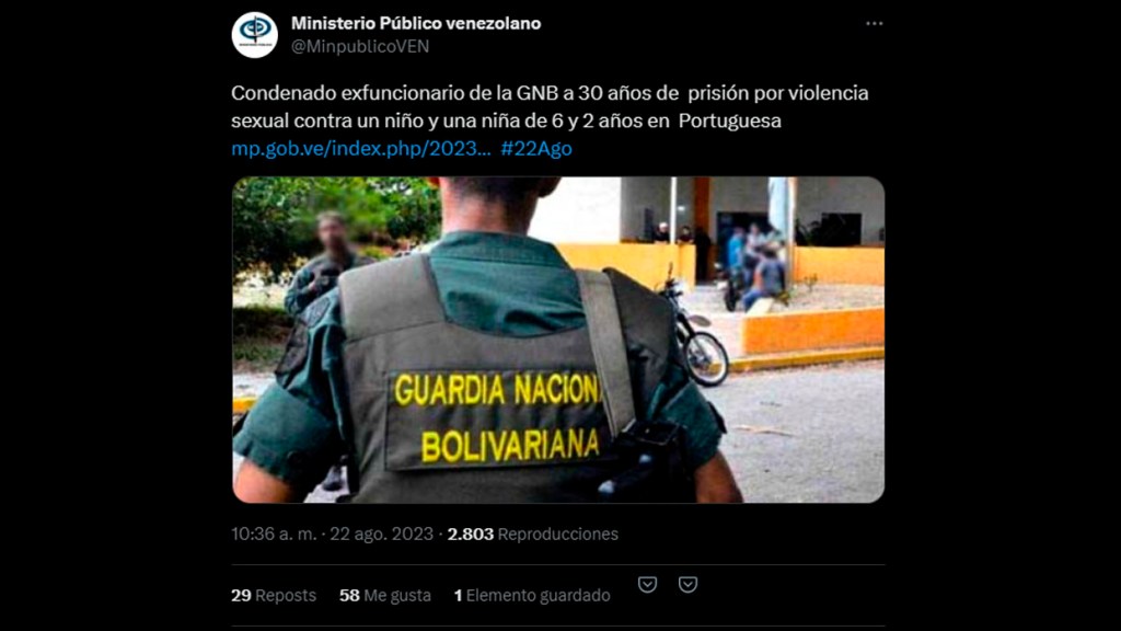 Un exfuncionario de la Guardia Nacional Bolivariana (GNB) fue condenado a 30 años de cárcel por haber abusado sexualmente de un niño y una niña de seis y dos años de edad, respectivamente.