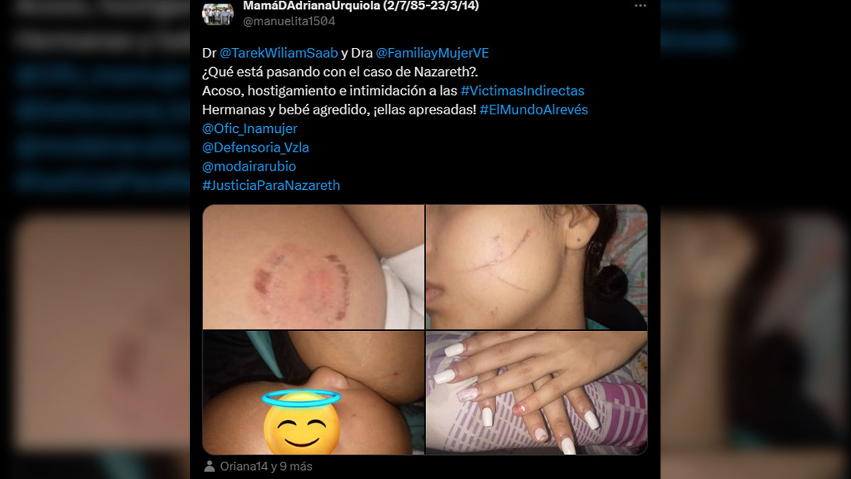 A través de la cuenta en la red social Twitter, X, MamádAdrianaUrquiola se presenta un audio en el que denuncia que familiares de Nazareth Marín, la trabajadora del Senamecf asesinada en marzo pasado, estarían sufriendo hostigamiento y amenazas por parte de funcionarios del Cuerpo de Investigaciones Científicas Penales y Criminalísticas (Cicpc) organismo al que pertenece uno de los detenidos por el femicidio.
