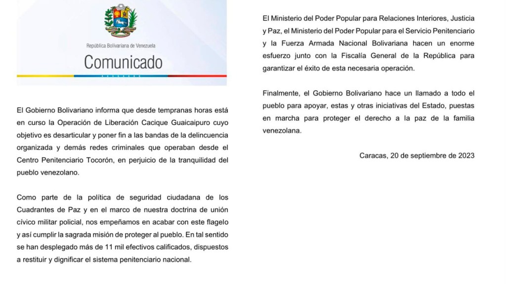 Un intenso operativo en el que participaron más de 11 mil hombres adscritos a distintos organismos de seguridad, policiales y militares, fue activado la madrugada de este miércoles 20 de septiembre con la intención de retomar el control del Centro Penitenciario de Aragua, mejor conocido como la Cárcel de Tocorón.