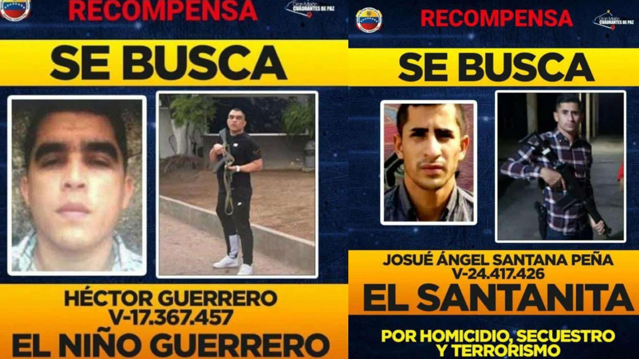 Dos carteles publicados en Instagram por el Cuerpo de Investigaciones Científicas, Penales y Criminalísticas (Cicpc) destacan que “órganos de seguridad ciudadana buscan a Héctor Guerrero; alias ‘El Niño Guerrero’, por su participación en múltiples delitos contra las personas y terrorismo”, y a Josué Ángel Santana Peña, alias «El Santanita», por los delitos de «homicidio, secuestro y terrorismo».
