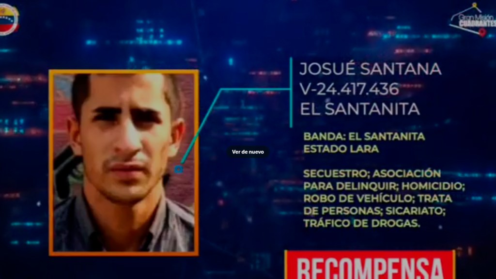 El listado presenta en segundo lugar a Josué Santana, alias “Santanita”, delincuente del estado Lara, buscado por homicidio, secuestro, extorsión, robo, trata de personas, tráfico de drogas.