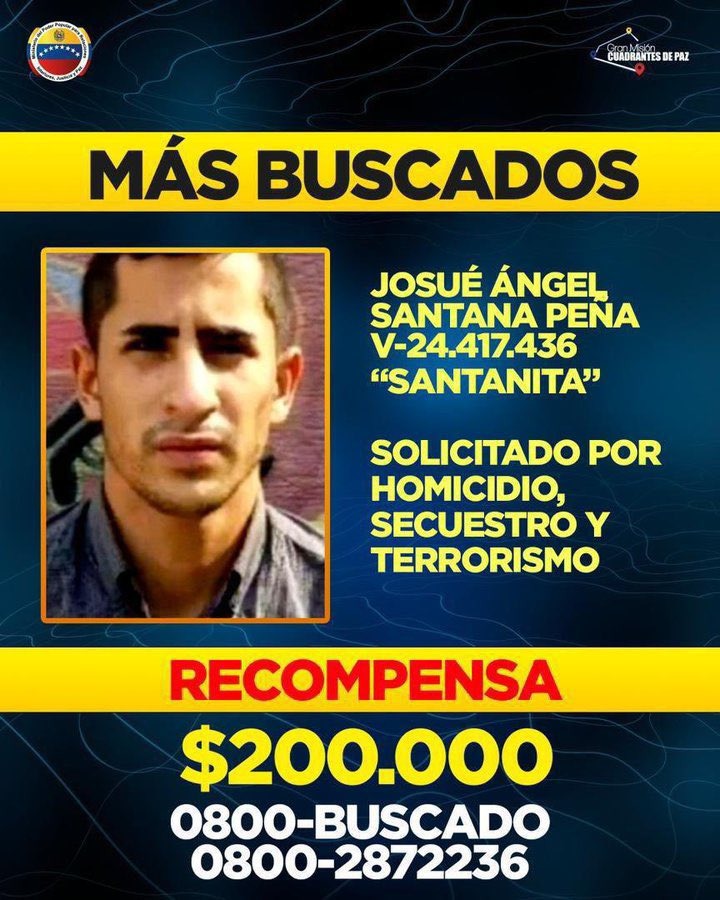 2- Josué Ángel Santana Peña, alias “El Santanita”, durante años azotó los estados Lara, Yaracuy y Carabobo. Se especializa en extorsión de comerciantes, industriales y productores agrícolas, además de secuestro y sicariato. La banda de alias “Santanita” está vinculada estrechamente con El Tren de Aragua. Este sujeto se habría alojado en la cárcel de Tocorón durante varios meses antes de la toma de ese centro penitenciario por el gobierno. Las autoridades ofrecen 200 mil dólares por su detención.