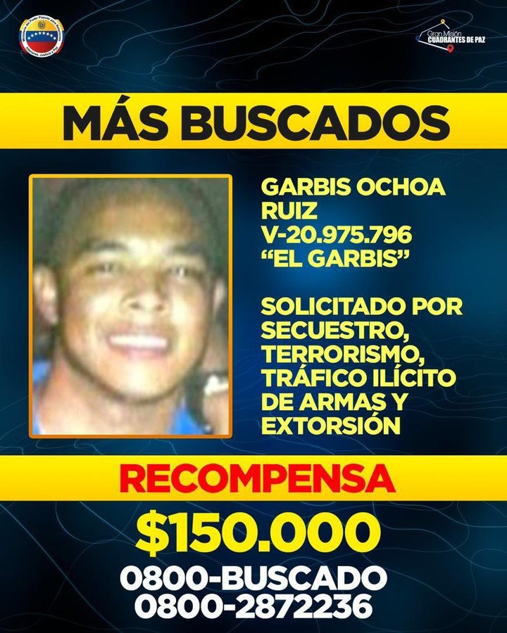 6- Garbis Ochoa, conocido por nombre de “El Garbis”, es el otro líder sobreviviente de la banda de la Cota 905, cuyos líderes lograron huir de la tenaza policial que intentó detenerlos el año 2021. Es requerido por terrorismo, tráfico de armas, extorsión. Se mantiene en el listado de los delincuentes más buscados de Venezuela, aunque se cree que está en Brasil. El Ejecutivo ofrece 150 mil dólares por su detención.