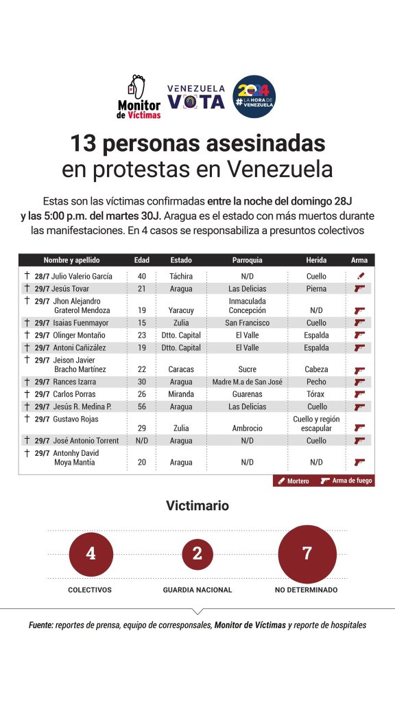 Al menos 13 civiles han muerto en las protestas que estallaron en el Distrito Capital y en al menos 19 estados de Venezuela tras la publicación de resultados de las elecciones presidenciales celebradas el domingo 28 de julio, informaron el martes 30 cuatro organizaciones de defensa de los derechos humanos.