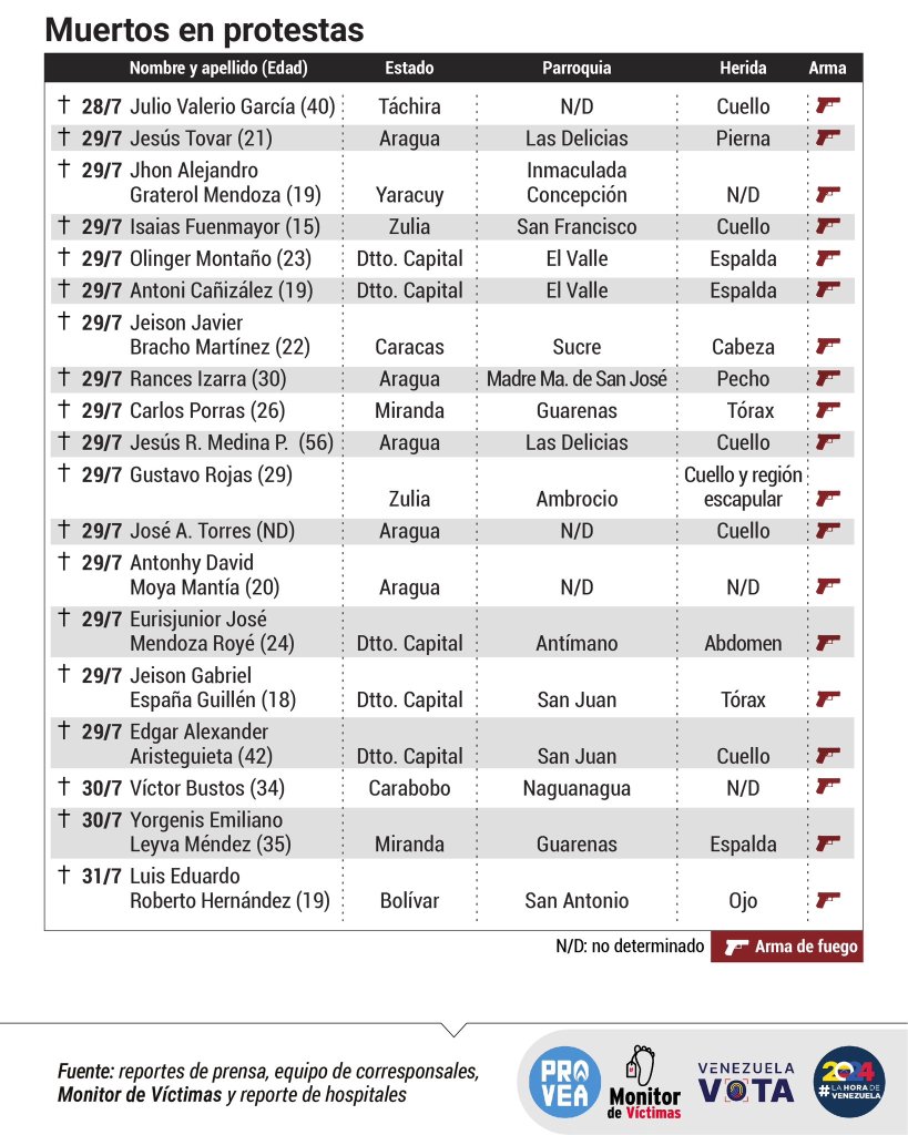 Entre el lunes 29 de julio y el jueves 1 de agosto han muerto al menos 19 personas durante manifestaciones tras el anuncio de los resultados de las elecciones presidenciales venezolanas del pasado 28 de julio, según datos recopilados por Monitor de Víctimas.